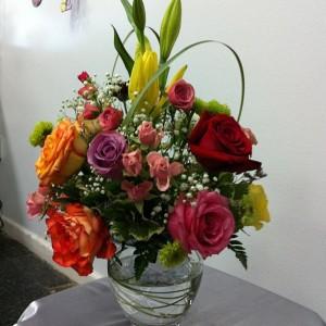 Mixed color Roses, Spray Roses, Lilies, Babies Breath and greenery. Brighten someone's day with this colorful arrangement.